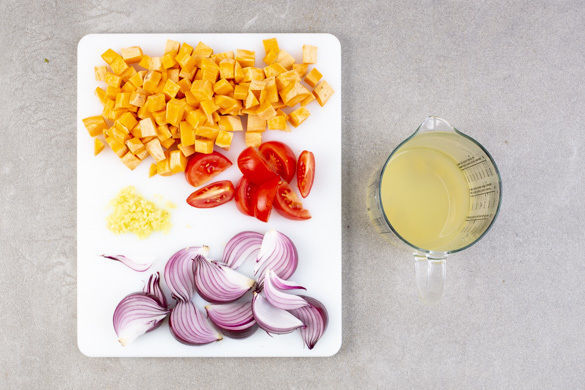 Die Süßkartoffel schälen und in ca. 1cm große Würfel schneiden. Die Tomaten halbieren und in ca. 1,5cm breite Spalten schneiden. Die Zwiebel schälen, halbieren und ebenfalls in ca. 1,5cm breite Spalten schneiden. ⅔ des Ingwers oder mehr schälen und fein reiben oder in kleine Würfel schneiden. Die ½ des Brühgewürzes in 200ml heißem Wasser auflösen.