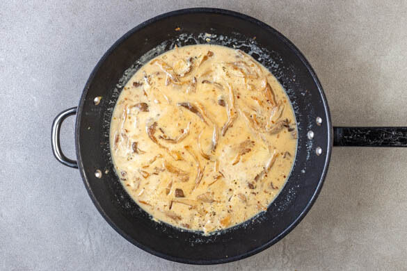 Die Zwiebelnund die Austernpilze in derselben Pfanne bei mittlerer Hitze 1–2Min. anschwitzen, dann 1EL Mehl hinzufügen und unterrühren. Mit 400ml Wasser und der Crème fraîche ablöschen und die ½ des Brühgewürzes unterrühren.