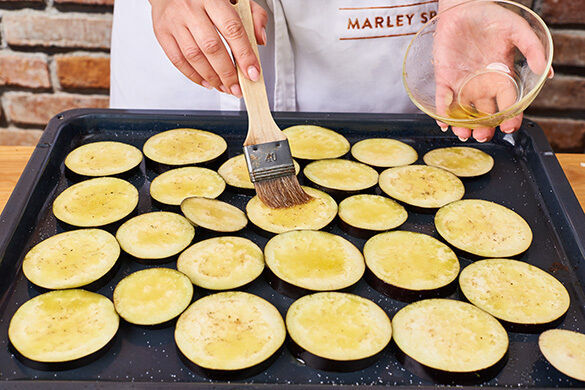 Die Auberginen auf zwei Backblechen verteilen und dünn mit Olivenöl bestreichen. Mit je 1 kräftigen Prise Salz und Pfeffer würzen und 5–8Min. im Ofen grillen, bis sie leicht bräunen. Die Brötchenstücke dazugeben und alles weitere 2–3Min. grillen, bis die Croûtons knusprig sind. Die Bleche aus dem Ofen nehmen und die Temperatur auf 220°C Ober-/Unterhitze umstellen.