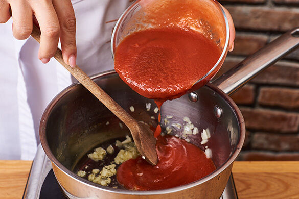 Die Zwiebeln in einem mittelgroßen Topf mit 2EL Olivenöl und 1 Prise Salz bei mittlerer Hitze 2–3Min. glasig anschwitzen. Den Knoblauch dazugeben und ca. 30Sek. mitgaren. Mit den passierten Tomaten und 200ml Wasser ablöschen und 1 kräftige Prise Zucker unterrühren. Die Sauce einmal aufkochen und bei niedriger Hitze ca. 5Min. köcheln lassen. Mit Salz und Pfeffer abschmecken.