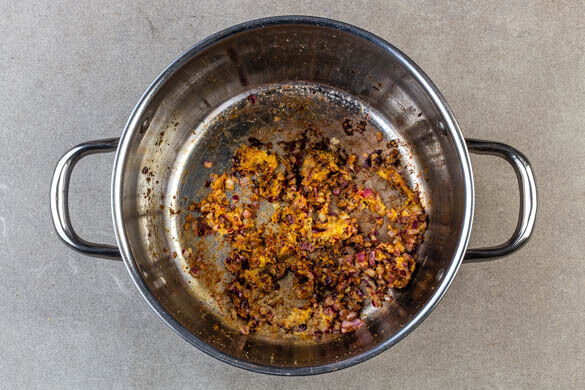 Die Zwiebeln in einem mittelgroßen Topf mit 1EL Olivenöl bei mittlerer Hitze 3–4Min. glasig anbraten. Die Knoblauch-Ingwer-Paste nach ca. 2Min. dazugeben und mitbraten, dann die Gewürzmischung unterrühren und 1–2Min. mitrösten, bis es anfängt, zu duften.