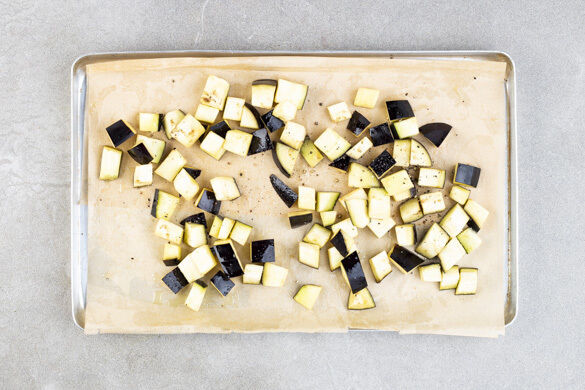 Den Backofen auf 220°C (200°C Umluft) vorheizen. Die Auberginen in kleine Würfel schneiden. Die Tomaten in grobe Stücke schneiden. Den Knoblauch schälen und fein würfeln.