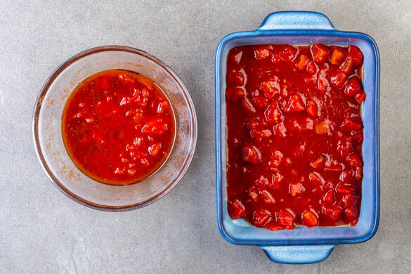 Die gehackten Tomaten mit 2EL Olivenöl und 2EL Balsamicoessig verrühren und die Sauce mit Salz und Pfeffer abschmecken. Die ½ der Sauce in einer großen Auflaufform gleichmäßig verstreichen.
