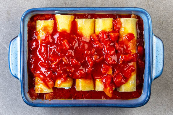 Die Nudelrollen mit der Nahtstelle nach unten in die Auflaufform legen. Mit der restlichen Tomatensauce bedecken und 15–20Min. im Ofen backen, bis die Nudelrollen fast gar sind.