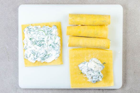 Die Ricotta-Spinat-Mischung großzügig auf insgesamt 5 Lasagneblättern verteilen. Die Füllung dabei bis an die Ränder streichen, dann die Lasagneblätter von der schmalen Seite her aufrollen.