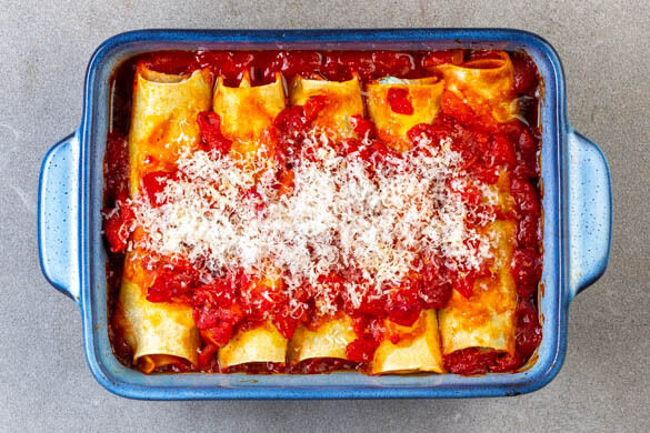 Die Nudelrollen mit der Nahtstelle nach unten in die Auflaufform legen. Mit der restlichen Tomatensauce bedecken und 15–20Min. im Ofen backen, bis die Nudelrollen fast gar sind.