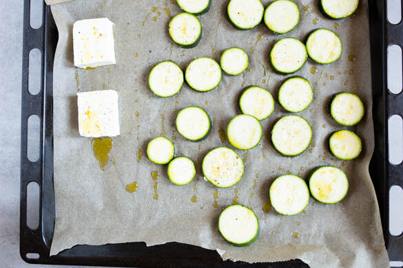 Den Feta jeweils vierteln. Die Zucchini in ca. 0,5cm dünne Scheiben schneiden. 4 Stücke Feta und die Zucchini auf ein mit Backpapier ausgelegtes Backblech legen, 2EL Olivenöl darüber träufeln und nach Belieben mit Salz und Pfeffer würzen. Für 10–15Min. im Ofen backen, bis der Feta goldbraun und die Zucchini gar ist.