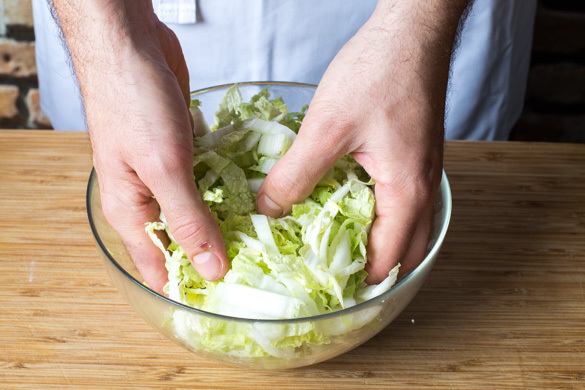 In einem großen Topf ausreichend gesalzenes Wasser für die Nudeln zum Kochen bringen. Den Chinakohl in sehr feine Streifen schneiden oder hobeln, mit 1TL Salz gut verkneten und ca. 10Min. ziehen lassen.