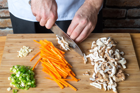 Die Stiele der Shiitakepilze entfernen, dann die Pilze in feine Scheiben schneiden. Die Karotten ggf. schälen und in feine Stifte schneiden. Die Lauchzwiebeln schräg in feine Ringe schneiden. Den Knoblauch schälen und fein würfeln.