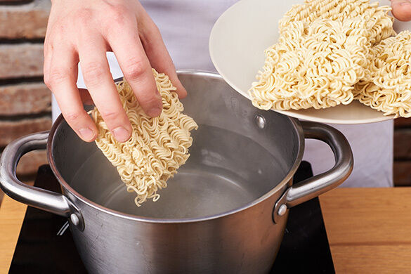 Die Nudeln in das kochende Wasser geben und in 3–5Min. bissfest kochen. In ein Sieb abgießen und kalt abschrecken.