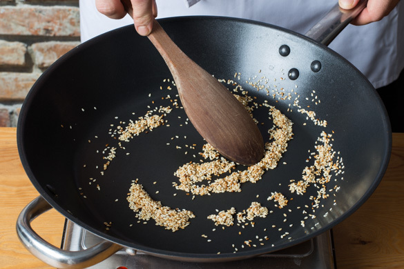 Den Sesam in einer großen Pfanne ohne Zugabe von Fett bei niedriger Hitze 1–2Min. goldbraun anrösten. Vorsicht, der Sesam kann schnell verbrennen. Zum Abkühlen aus der Pfanne nehmen und beiseitestellen. Die Pfanne aufbwahren.