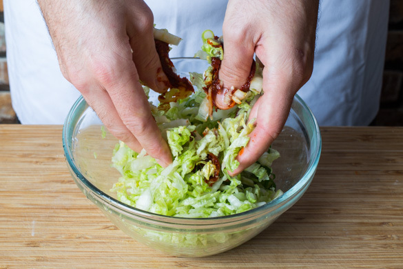 In einem mittelgroßen Topf ausreichend gesalzenes Wasser für die Nudeln zum Kochen bringen. Den Chinakohl in sehr feine Streifen schneiden oder hobeln, mit 1TL Salz gut verkneten und ca. 10Min. ziehen lassen.
