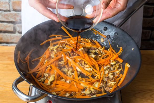 Die Stiele der Shiitakepilze entfernen, dann die Pilze in feine Scheiben schneiden. Die Karotten ggf. schälen und in feine Stifte schneiden. Die Lauchzwiebeln schräg in feine Ringe schneiden. Den Knoblauch schälen und fein würfeln.