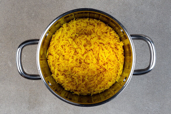 In einem mittelgroßen Topf 200ml Kokosmilch mit 400ml Wasser aufkochen. Den Reis in einem Sieb kalt abspülen, bis das Wasser klar bleibt. Sobald das Wasser kocht, den Reis mit dem Currypulver und ½TL Salz hineingeben und abgedeckt bei niedrigster Hitze 10–12Min. kochen, bis das Wasser aufgesogen und der Reis gar ist. Ca. 5Min. ohne Hitzezufuhr ziehen lassen.