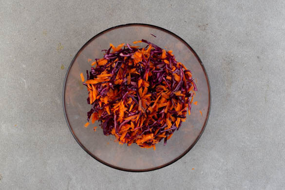 Den Rotkohl in feine Streifen schneiden. Die Karotten ggf. schälen und grob raspeln. Dann mit dem Rotkohl und dem Dressing vermengen und das Gemüse 1–2Min. gut durchkneten, damit es weich wird. Dabei am besten Küchenhandschuhe tragen.