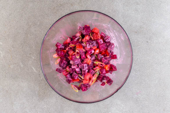 Die Rote Bete, die Tomaten und die weißen Lauchzwiebeln gründlich mit 1EL veganer Mayonnaise und 1EL Essig verrühren, mit Salz und Pfeffer abschmecken. Die Törtchen mit den grünen Lauchzwiebeln garnieren und mit dem Rote-Bete-Tomaten-Salat servieren.