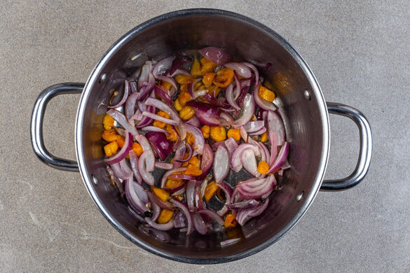 Die Zwiebeln und die getrockneten Datteln in einem großen Topf mit 2EL Olivenöl bei mittlerer Hitze 2–3Min. braten, bis die Zwiebeln zu bräunen beginnen.