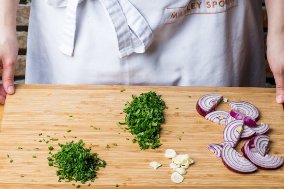 Die Petersilienblätter abzupfen und fein hacken. Den Schnittlauch in kleine Röllchen schneiden. Die Zwiebeln schälen, halbieren und in grobe Scheiben schneiden. Den Knoblauch schälen und in feine Scheibchen schneiden.