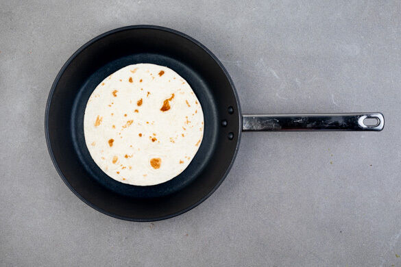Eine große Pfanne auf mittlerer Stufe erhitzen. 8 Tortillas nacheinander ohne Zugabe von Fett auf jeder Seite ca. 30Sek. aufwärmen, dann aus der Pfanne nehmen und warm halten.