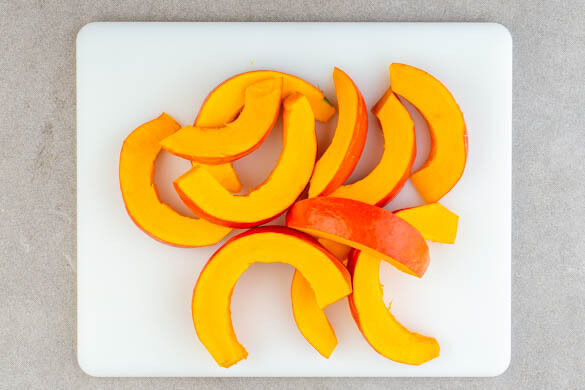 Den Backofen auf 220°C (200°C Umluft) vorheizen. In einem mittelgroßen Topf 800ml Wasser mit dem Brühgewürz für den Perlencouscous zum Kochen bringen. Die Kürbisse halbieren, die Fasern und Kerne mit einem Löffel herausschaben und das Fruchtfleisch in ca. 2cm dicke Spalten schneiden.