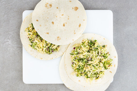 Die Zucchini mit den restlichen Zwiebeln, der restlichen Petersilie und dem Käse vermengen. Mit je 1 Prise Salz und Pfeffer würzen. 2 Tortillas auslegen und die Zucchini-Käse-Mischung gleichmäßig darauf verteilen, dabei rundum einen ca. 2cm breiten Rand frei lassen. Mit jeweils 1 Tortilla bedecken. Eine große Pfanne auf mittlerer Stufe erhitzen.