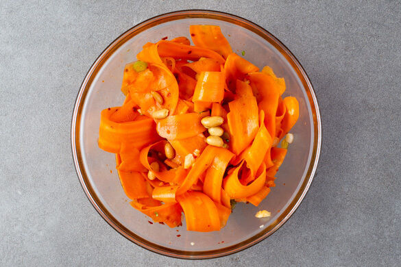 Die Erdnüsse in einer mittelgroßen Pfanne mit 1EL Pflanzenöl bei mittlerer Hitze in 1–2Min. appetitlich braun anbraten. Die heißen Erdnüsse samt Öl über den Karottensalat gießen und gut vermengen.
