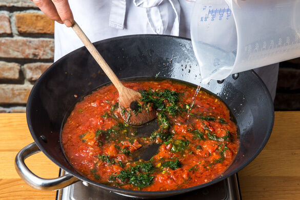 Den Knoblauch in einer großen Pfanne mit 2EL Olivenöl bei mittlerer Hitze ca. 30Sek. anbraten. Die gehackten Tomaten mit der ½ des Dills, 1EL Essig und 100–150ml Wasser hinzugeben. Das Brühgewürz einrühren und die Sauce bei mittlerer Hitze in 4–5Min. sanft einköcheln lassen.