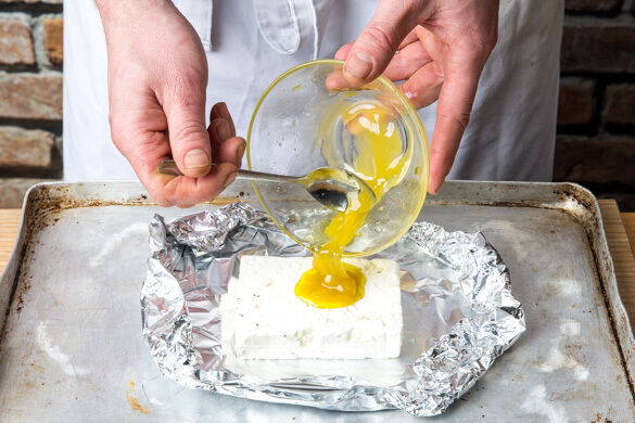 Den Feta trocken tupfen und nebeneinander auf ein Stück Aluminiumfolie legen. Die Ränder der Folie nach oben falten, um einen Behälter zu formen, und auf ein Backblech setzen. 2EL Honig mit 2EL Olivenöl verrühren und über den Feta träufeln. Nach Geschmack mit Pfeffer würzen und den Feta im Ofen in 3–5Min. goldbraun backen.