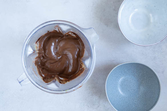 Die Avocado, die restlichen Birnenwürfel, den Ahornsirup, 100ml Wasser und 1 Prise Salz in einen Standmixer geben und fein pürieren. Die geschmolzene Schokolade bei ausgeschaltetem Gerät dazugießen und alles noch ca. 1Min mixen.
