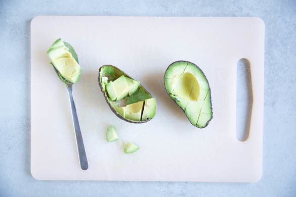 Die Avocado halbieren, den Kern entfernen, dann das Fruchtfleisch kreuzweise bis zur Schale einschneiden und mit einem großen Löffel aus der Schale lösen.