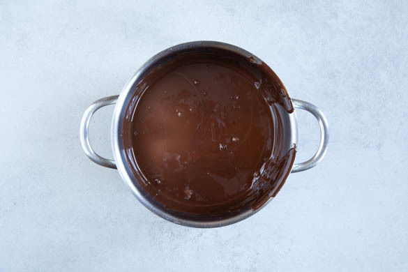 Die Schokolade in Stücke brechen und in einem weiteren kleinen Topf bei mittlerer Hitze langsam schmelzen, dabei regelmäßig rühren.