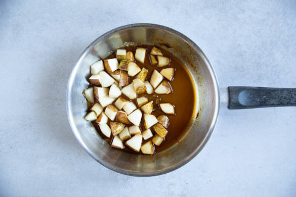 Die Birnen halbieren, entkernen und in ca. 1cm kleine Würfel schneiden. 1EL (braunen) Zucker in dem Topf bei mittlerer Hitze erwärmen und warten, bis der Zucker goldgelb geschmolzen ist. Die 1/2 der Birnenwürfel und 1EL Wasser dazugeben und die Birnen abgedeckt so lange garen, bis sich der Karamell zu einer Sauce gelöst hat.
