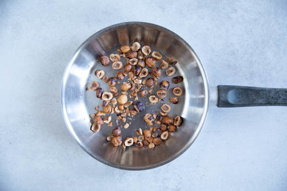 Die Nüsse grob hacken und in einem kleinen Topf bei mittlerer Hitze 30–90sek. goldbraun anrösten. Zum Abkühlen auf einem Teller beiseitestellen. Den Topf für den nächsten Schritt aufbewahren.