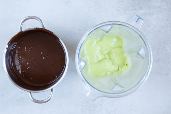 Die Avocado, die restlichen Birnenwürfel, den Ahornsirup, 200ml Wasser und 1 Prise Salz in einen Standmixer geben und fein pürieren. Die geschmolzene Schokolade bei ausgeschaltetem Gerät dazugießen und alles noch ca. 1Min mixen.