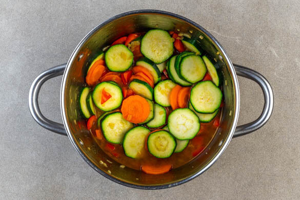 Das Brühgewürz und das heiße Wasser aus dem Wasserkocher in den Topf geben und gut rühren, damit sich das Gemüse vom Topfboden löst.