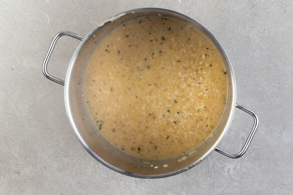 Den Reis nach und nach mit der Brühe ablöschen und stetig rühren, damit der Reis nicht ansetzt. Diesen Vorgang 18–20Min. lang wiederholen, bis die Brühe aufgebraucht und der Reis bissfest ist. Evtl. etwas mehr Wasser zugeben.