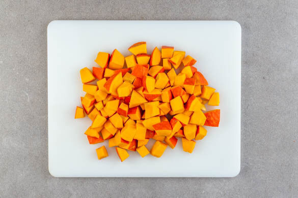 Die Kichererbsen in einem Sieb mit kaltem Wasser abspülen und abtropfen lassen. Den Kürbis samt Schale halbieren, entkernen und in ca. 2cm große Würfel schneiden.