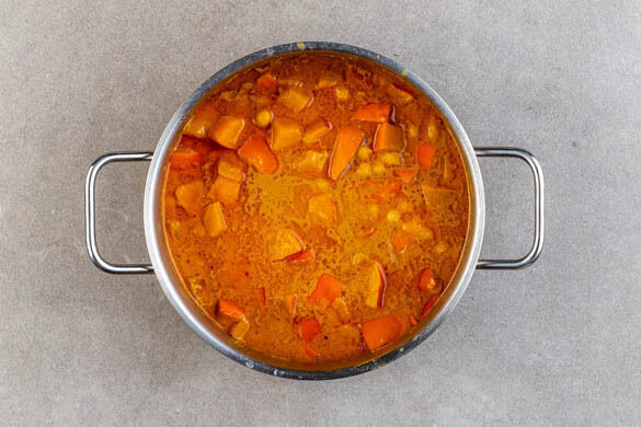 Den Kürbis mit 1TL Salz in einem großen Topf mit 4EL Pflanzenöl bei mittlerer bis starker Hitze unter Rühren ca. 3Min. anbraten. Die Currypaste und die ½ der Gewürzmischung zugeben und ca. 1Min. mitbraten. Die Kokosmilch, die Kichererbsen und 200–250ml Wasser einrühren und das Curry abgedeckt 11–16Min. köcheln lassen, bis der Kürbis weich ist. Dabei häufig umrühren.