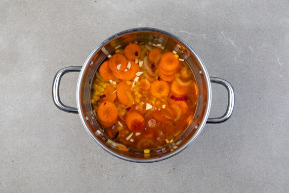 Die Karotten, den Sellerie und die Zwiebeln in einem mittelgroßen Topf mit 1EL Olivenöl und 1 Prise Salz bei mittlerer Hitze 2–3Min. anbraten. Den Knoblauch schälen und fein würfeln, dann mit dem Mais und der ½ des geräucherten Paprikapulvers oder nach Geschmack mehr ebenfalls in den Topf geben und 3–4Min. mitbraten.