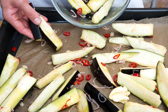 Den Backofen auf 220°C (200°C Umluft) vorheizen. Die Aubergine in 2–3cm dicke Spalten schneiden. Die Zwiebeln schälen und in feine Ringe schneiden. Den Knoblauch schälen und fein würfeln. Die Limette in Spalten schneiden. Die Peperoni in feine Ringe schneiden. Tipp: Wer es weniger scharf mag, verwendet weniger Peperoni und entfernt die Kerne.