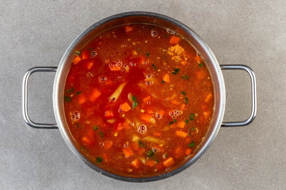 Die Pasta in den Topf geben, mit den passierten Tomaten und dem kochenden Wasser übergießen und aufkochen. Die Pasta abgedeckt bei mittlerer Hitze in 7–9Min. bissfest kochen, dabei gelegentlich umrühren. Ggf. mehr Wasser hinzufügen, falls die Pasta am Topfboden haften bleibt. Für die letzten ca. 5Min. der Garzeit den Deckel abnehmen, um die Sauce etwas einzuköcheln.