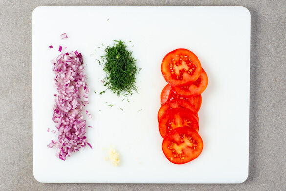 Die Zwiebeln schälen, halbieren und fein würfeln. Den Knoblauch schälen und durch eine Knoblauchpresse drücken oder sehr fein würfeln. Den Dill samt Stängeln fein schneiden. Die Tomaten in dünne Scheiben schneiden.