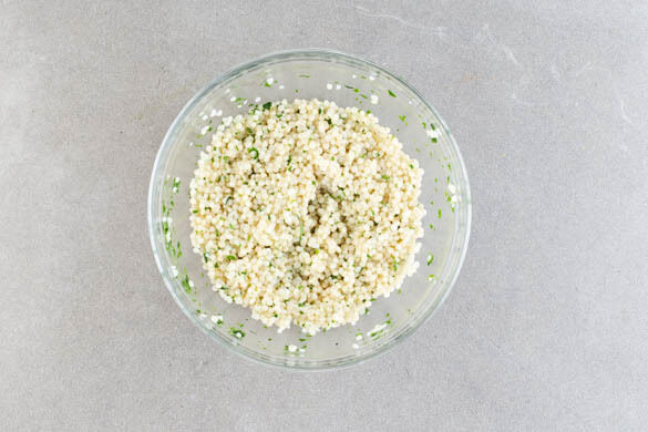 Den Perlencouscous in das kochende Wasser rühren und abgedeckt bei mittlerer Hitze 8–10Min. sanft köcheln lassen, bis das Wasser aufgesaugt und der Perlencouscous gar ist, dann mit 1TL Zitronenschale, 3EL Zitronensaft, der ½ der Petersilie sowie 2EL Olivenöl vermengen. Mit Salz und Pfeffer abschmecken.