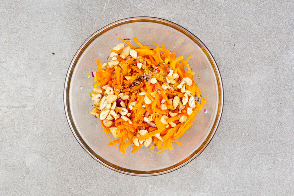 Aus 2EL Olivenöl, 2EL Essig und je 1 kräftigen Prise Salz und Pfeffer ein Dressing anrühren. Die Karotte ggf. schälen, mit einer Küchenreibe grob raspeln und mit den Cashews unter das Dressing mengen. Die aufbewahrten Paprika- und Zwiebelstreifen klein schneiden und ebenfalls untermengen.