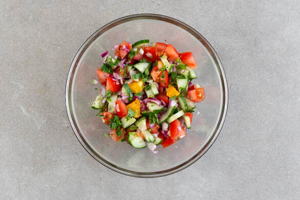 Die Zwiebel schälen, halbieren und fein würfeln. Die Gurke längs vierteln und in dünne Scheiben schneiden. Die Tomaten in 0,5–1cm große Stücke schneiden. Den Koriander samt Stängeln fein schneiden. Die Zwiebeln, die Gurken, die Tomaten und den Koriander unter die Orangen mengen und 2EL hellen Essig unterrühren. Mit Salz, Pfeffer und ggf. mehr Essig abschmecken.