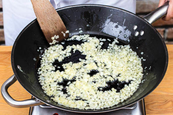 Das Brühgewürz in 1,5L heißem Wasser auflösen. In einer großen Pfanne 1EL Butter bei mittlerer Hitze schmelzen, dann 1EL Olivenöl unterrühren. Die Zwiebeln und den Knoblauch hinzugeben, mit 1 Prise Salz bestreuen und 3–4Min. glasig anschwitzen.