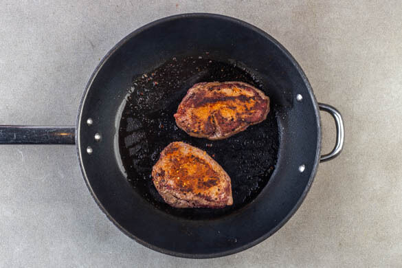 Eine große Pfanne ohne Öl stark erhitzen, dann das Fleisch mit 1EL Olivenöl in die Pfanne geben und auf jeder Seite 2–3Min. braten, abhängig davon, ob es medium oder eher durchgebraten sein soll. Aus der Pfanne nehmen und bis zum Servieren auf einem Teller abgedeckt ruhen lassen.