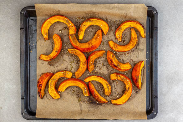 Die Kürbisspalten auf zwei mit Backpapier ausgelegte Backbleche legen, jeweils mit 1EL Olivenöl und je 1 kräftigen Prise Salz und Pfeffer würzen und ca. 20Min. im Ofen rösten. Dann wenden und die Kürbisspalten jeweils mit der ½ der Gewürzmischung bestreuen und mit ½EL Olivenöl beträufeln. Die Position der Bleche tauschen und die Kürbisspalten noch 5–10Min. goldgelb und gar rösten.