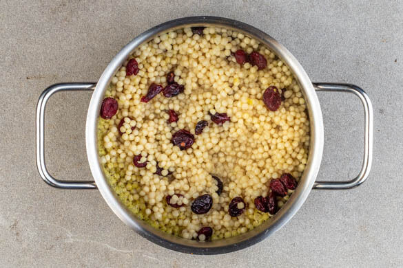Den Perlencouscous in die kochende Brühe rühren und abgedeckt bei mittlerer Hitze 8–10Min. sanft köcheln lassen, bis die Brühe aufgesaugt und der Perlencouscous gar ist. Vom Herd nehmen und die Cranberrys unterrühren. Bis zum Servieren abgedeckt beiseitestellen.