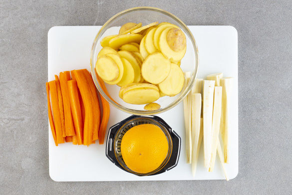 Die Kartoffeln samt Schale in ca. 1cm dicke Scheiben schneiden. Die Karotten ggf. schälen und der Länge nach in ca. 1cm breite Stifte schneiden. Die Pastinake schälen und ebenfalls in ca. 1cm breite Stifte schneiden. Die Orange halbieren und auspressen.
